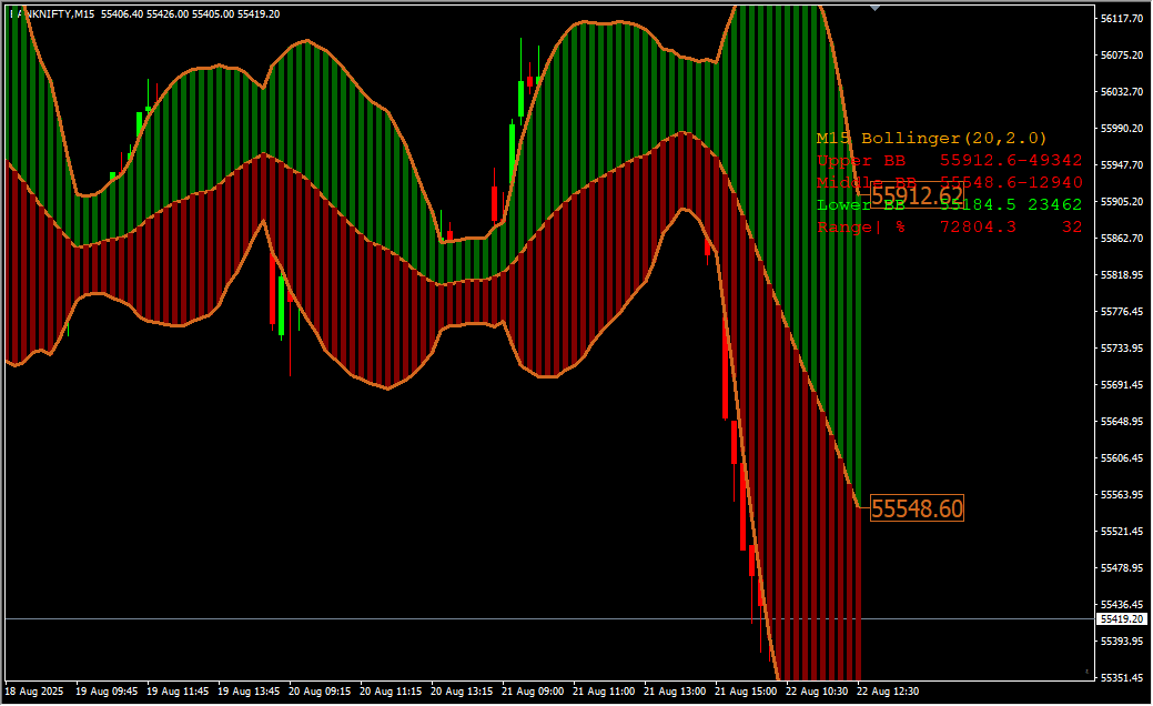 Short Trade: Enter when price rejects from upper band or breaks mid-band downward, set stop-loss above the upper band, and exit when price returns above mid-band.