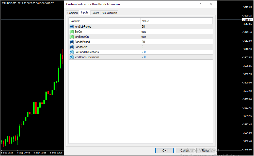 • IchiBands Deviations → Number of deviations or spacing used for Ichimoku bands (if applicable).
