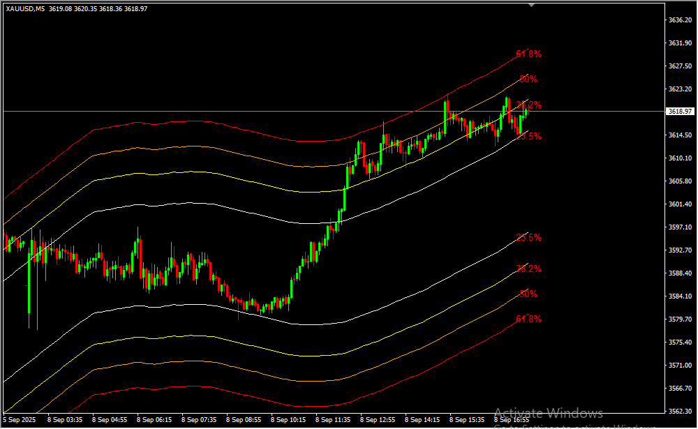 📊 Fibonacci-Based Channels – Upper and lower channel lines are plotted at 23.5%, 38.2%, 50%, and 61.8% of a moving average to mathematically define price levels.