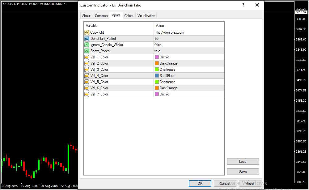 Val_1_Color … Val_7_Color → Colors assigned to different levels or lines (e.g., Donchian Channel levels or other plotted values).