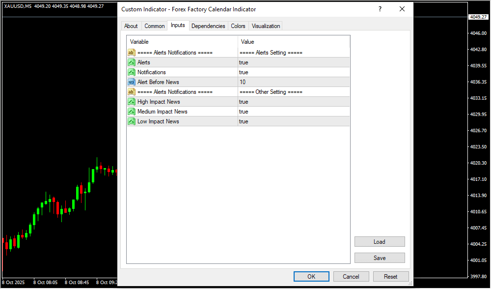 Fully customizable: choose impact levels, alert times, table display, and vertical line visibility.
