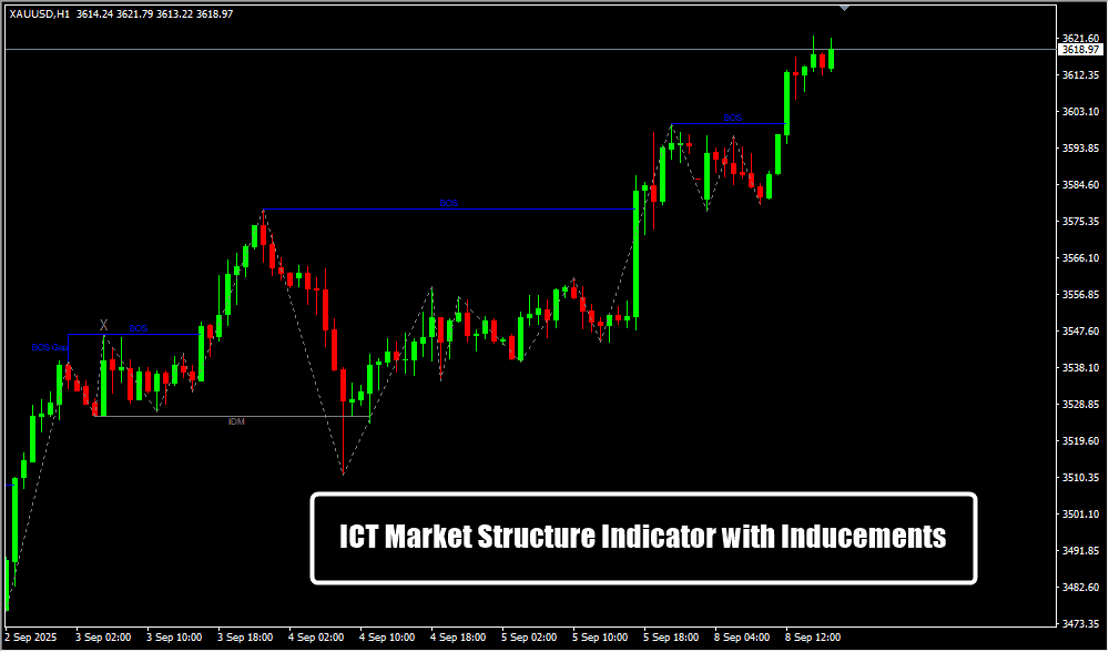 Identifies CHoCH (Change of Character), BOS (Break of Structure), and IDM (Inducement Detection) automatically on MT4.