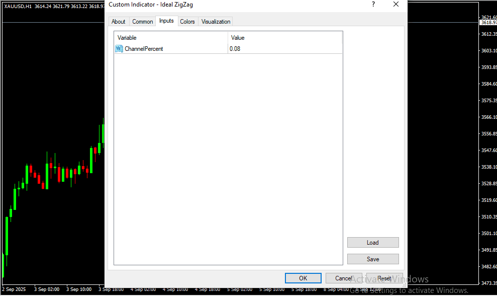• ChannelPercent – Determines the percentage distance from the central line to form the upper and lower boundaries of the channel (used to define channel width).