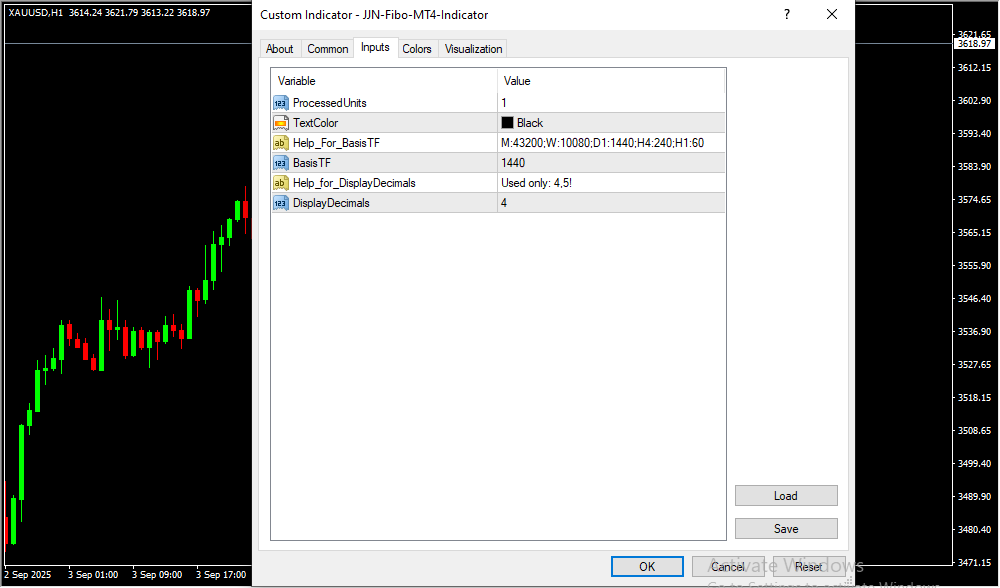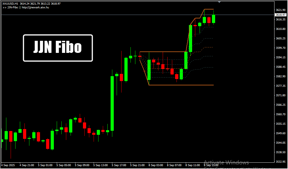 The JJN Fibo MT4 Indicator automatically identifies recent swing highs and lows and draws Fibonacci retracement and extension levels on the chart.