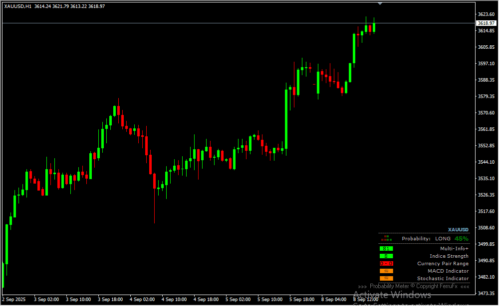 📈 Graphical Probability Representation – Divided into sections showing chances of successful buy or sell trades.