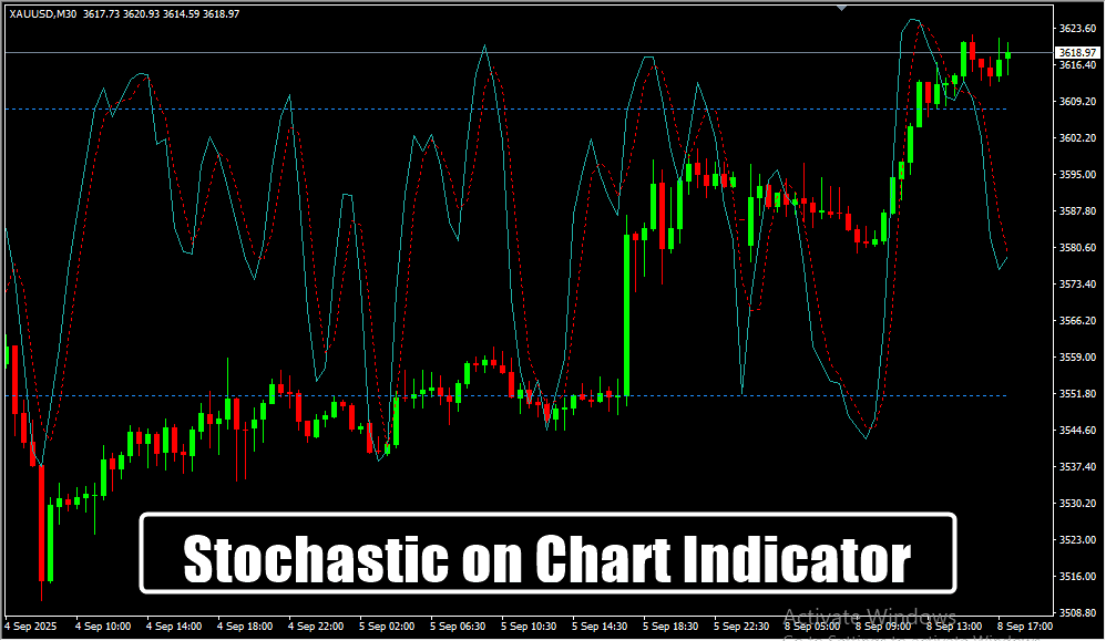 Plots the Stochastic (%K and %D) lines directly on the price chart