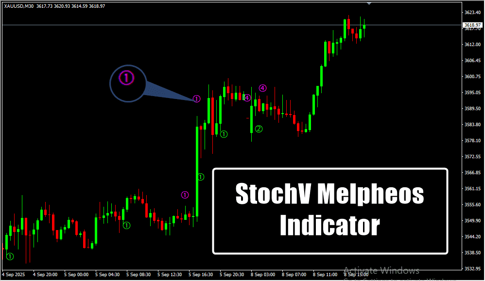 Based on the stochastic structure, StochV Melpheos identifies overbought and oversold market conditions.
