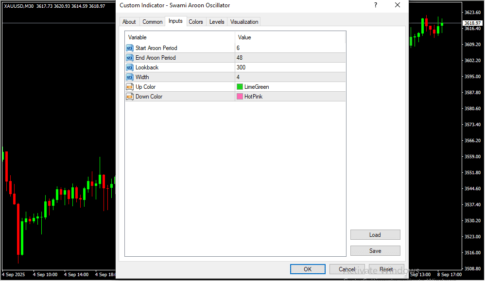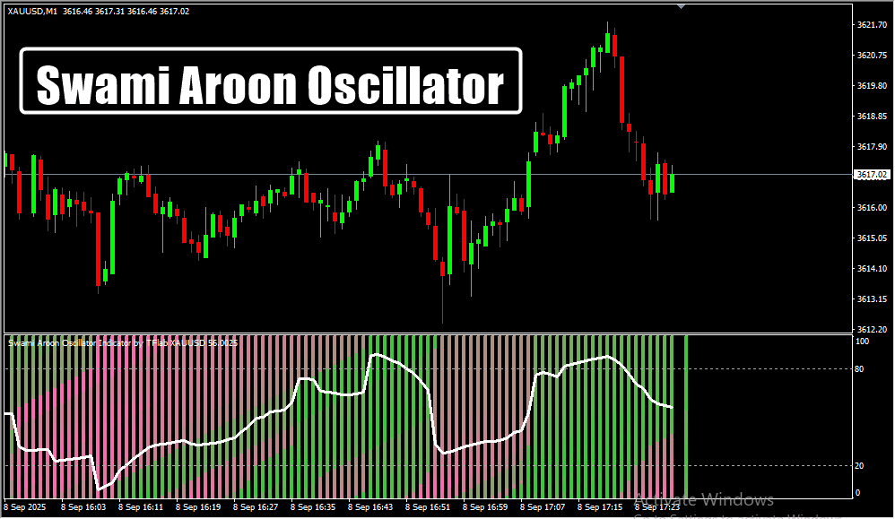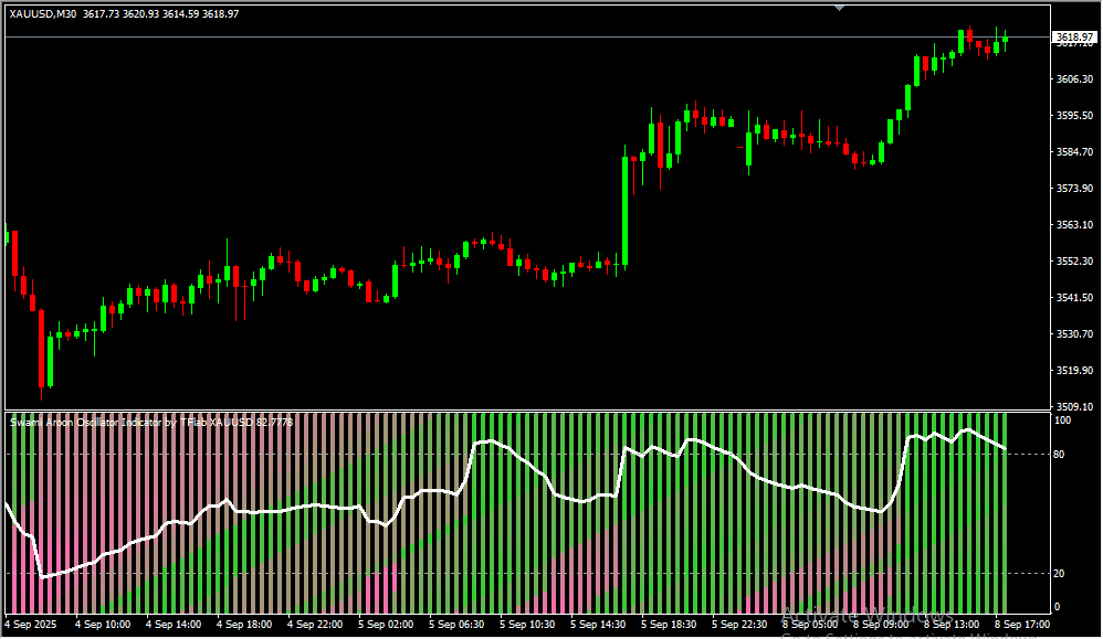 Uptrend example: XAU/USD 4-hour chart, bars shift from pink to green, signaling entry