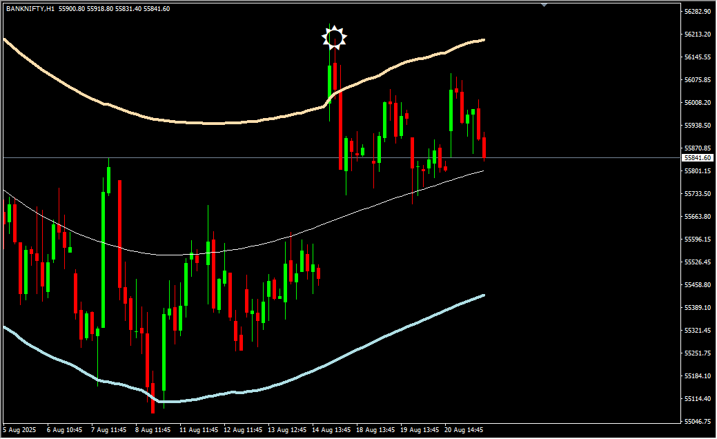 • Buy setup: Price breaks the lower band, forms wick rejections, a buy star appears, and a bullish engulfing pattern confirms entry.