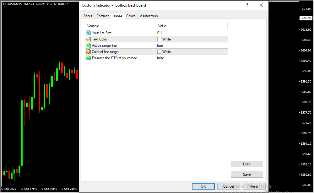 Text Color | Color of text displayed on the chart (e.g., for labels or info panels). |