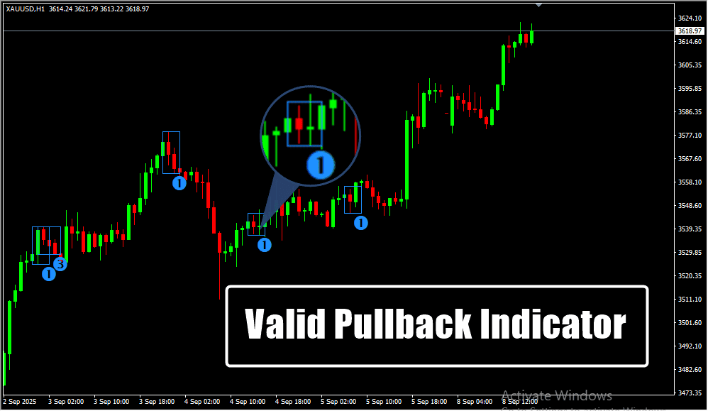 Numbers displayed on the chart specify the type of pullback detected.