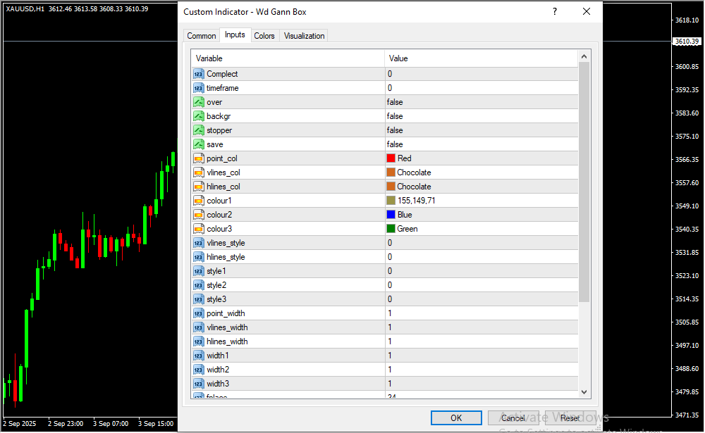 📦 Gann Box Display – Plots boxes on the chart to visualize price action.